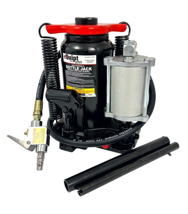 This heavy duty 20,000kg eQuipt Air/Manual Bottle Jack packs a big punch, providing enough lifting power for use with farm vehicles, heavy-duty machinery, industrial construction equipment and more. The 2 piece removable handle is long enough to lift the load with ease and also helps to position the jack. Use this workhorse with a 110-125psi rated air pressure supply to lighten the load and provide the fast, strong lifting power you need, or operate it manually for normal operation just about anywhere.